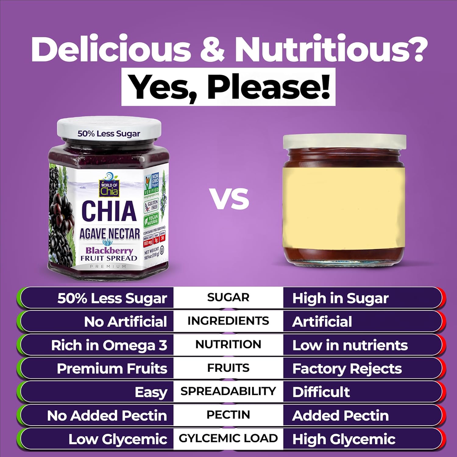 Experience the power of chia in a delicious, clean, and natural fruit spread. Thickened with healthy, nutritive organic chia seeds instead of synthetic pectins, and sweetened with pure non-GMO cane sugar rather than GMO sugars or high-fructose corn syrup. Enjoy an unmatched real blackberry flavor and a uniquely wholesome sensorial experience.